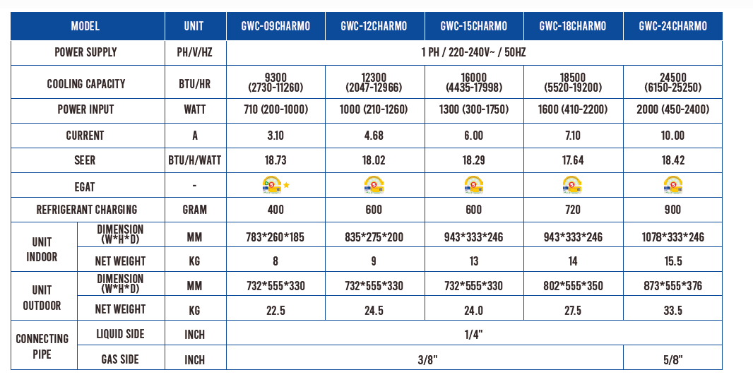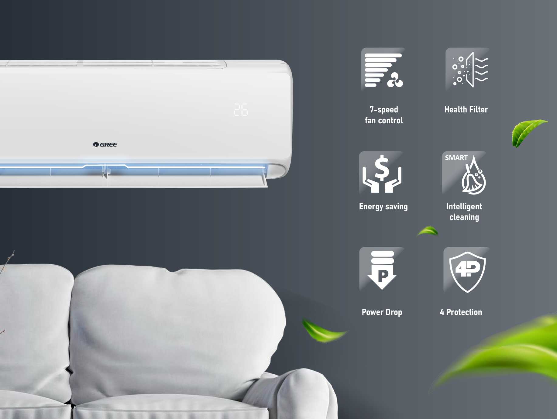 Gree CHARMO Series is a high-performance inverter air conditioner designed to deliver stable, comfortable cooling with excellent energy efficiency and long-term durability. Powered by advanced Inverter technology, it helps maintain a consistent temperature while reducing electricity consumption, and uses environmentally friendly R32 refrigerant for efficient cooling with lower environmental impact. CHARMO Series is available in 5 models, covering capacities from 9,300/12,300/16,000/18,500/24,500 BTU, making it suitable for everything from small rooms to larger spaces. It comes with comfort-enhancing features such as Fast Cooling and Turbo Mode for rapid temperature drop, I-FEEL to sense the temperature around the user for more precise comfort control, Energy Saving to reduce daily power usage, and an LED Display for clear operating status, along with a Timer for convenient scheduling and better energy management. For improved cleanliness and air quality, Health Filter helps provide cleaner airflow, while Intelligent Cleaning reduces dirt buildup inside the unit. Built for durability in humid conditions, Blue Fin & Gold Fin and Advanced Corrosion Protection help protect against moisture and corrosion, while X-Fan helps remove remaining moisture after shutdown to reduce odors. Reliable operation is further supported by Wide Voltage Range and Power Drop for stable performance under unstable power conditions, along with 4 Protection for enhanced safety and a DIY Filter for easier maintenance.
