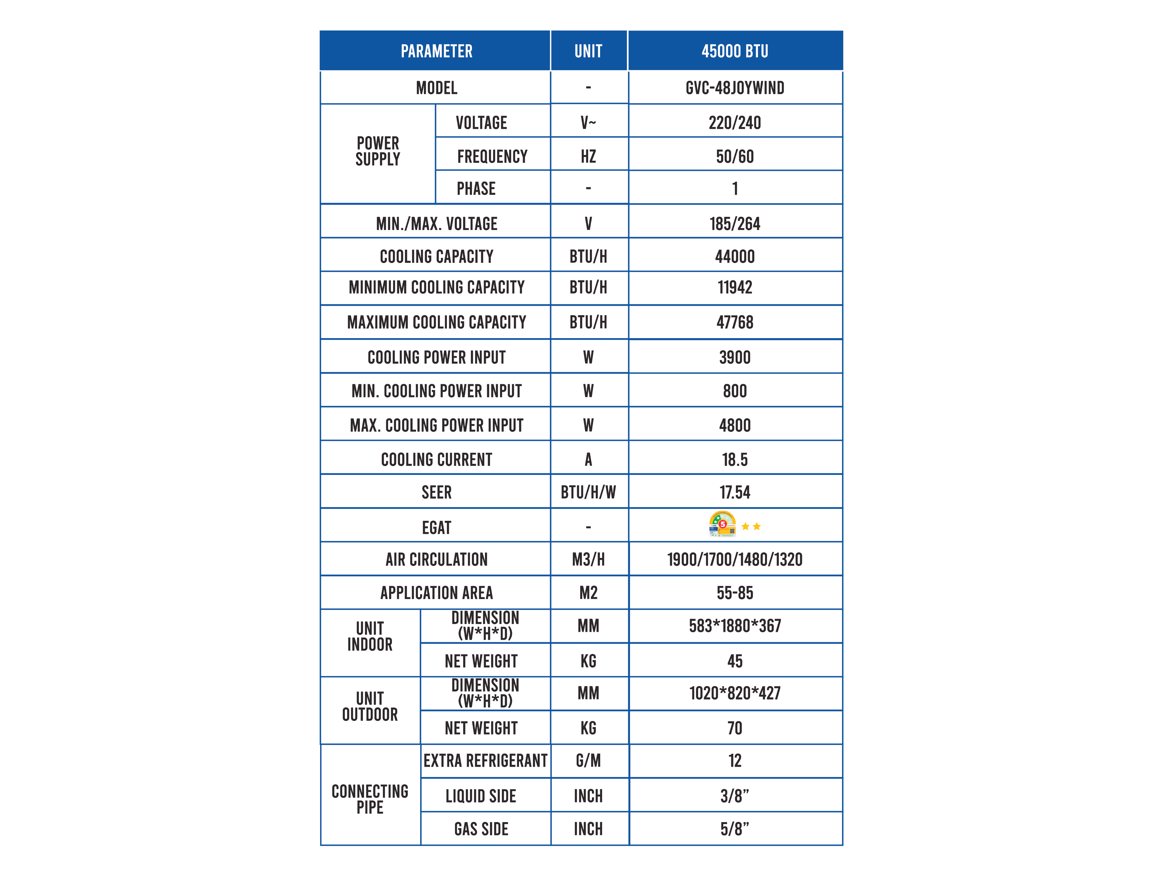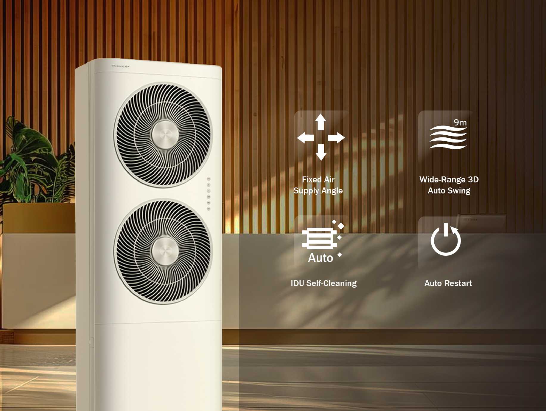Gree JOY WIND is designed to deliver powerful, wide, and fast cooling across large spaces with strong and evenly distributed airflow. It features a dual-blower system inspired by aircraft turbines, with 40 cm blowers on both the top and bottom, ensuring efficient air supply and high-performance circulation. With an impressive air volume of up to 2050 m³/h, JOY WIND cools the room quickly and effectively. The upper air outlet grille is engineered to guide airflow efficiently, allowing an air throw distance of up to 9 meters, while the lower grille outlet can be turned on or off independently to match your comfort preference—whether you want stronger airflow or a softer breeze. The lower outlet also helps distribute air widely to cover the entire room for all-round comfort. For easy maintenance, JOY WIND adopts a smart design that can be cleaned in just two simple steps, with removable air outlet grilles and a side pull-out air filter for quick and efficient dust removal. Available in 1 model with a cooling capacity of 45,000 BTU, Gree JOY WIND is an ideal solution for large areas that require powerful and consistent cooling.