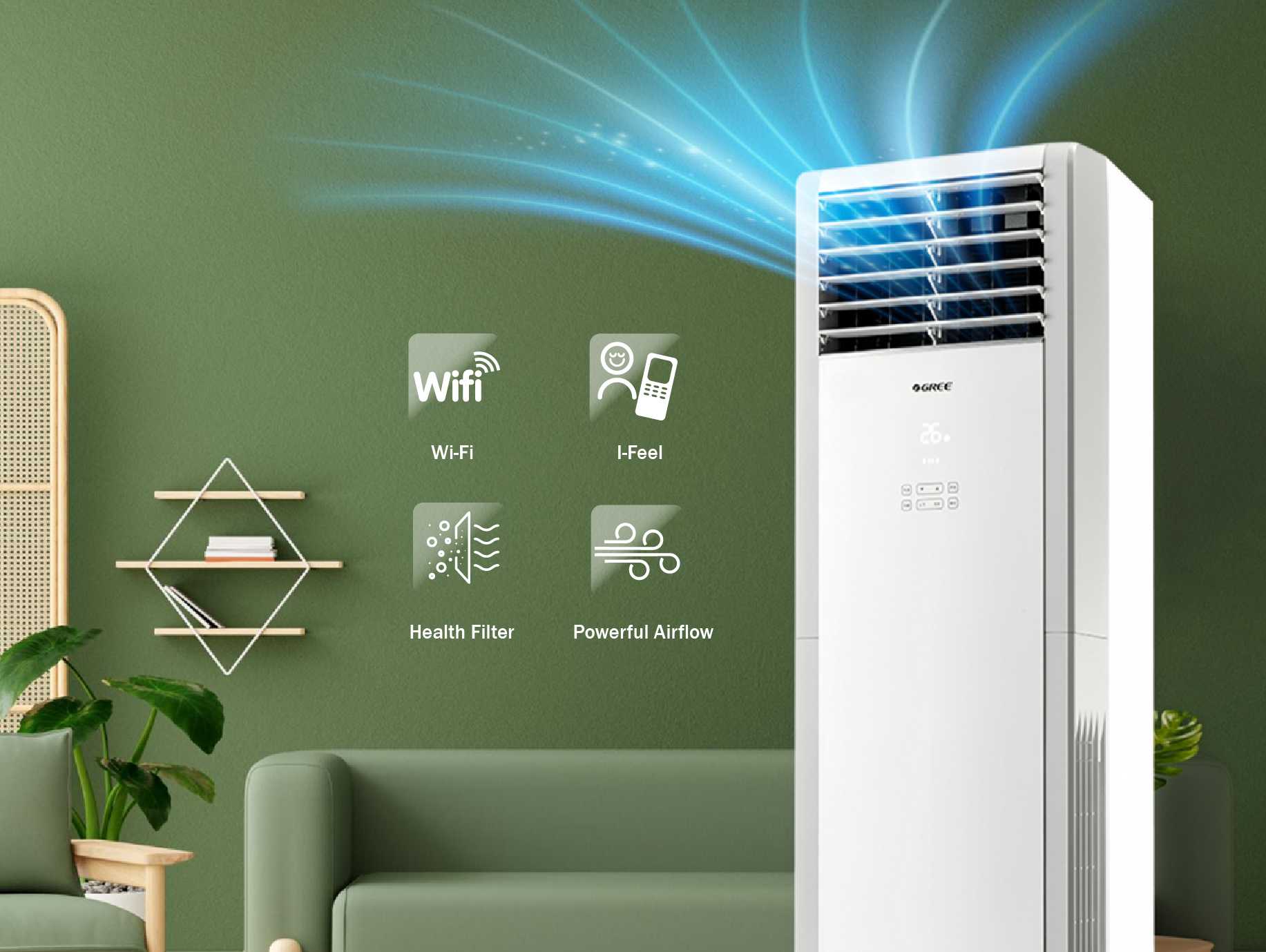 Gree TS Floor Standing Series is a powerful floor-standing air conditioner designed to deliver strong, comfortable cooling for large spaces such as living areas, hotel lobbies, restaurants, offices, and open commercial environments. Available in 5 models with cooling capacities from 17,000/22,000/29,000/40,000/48,800 BTU, it provides flexible options to match different room sizes and cooling demands. Equipped with Wi-Fi for convenient remote control, TS Series also features Powerful Airflow to cool large areas faster and more evenly, while 3D Airflow helps distribute air in multiple directions for wider coverage. For precise comfort, I-FEEL senses the temperature around the user, and the Health Filter supports cleaner airflow. Everyday operation is made easier with Turbo Mode for rapid cooling, a Timer for scheduled control, and Wide Voltage Range for stable performance even when power supply is unstable. Additional reliability and safety come from Self Diagnosis, Automatic Restart, Child Lock, Fire Protection, and 4 Protections, while Noise Reduction helps creates a quieter environment. Built for durability, TS Series includes a Strong Outdoor Unit, Anti-Vibration, Advanced Anti-Corrosion, and an Upgraded Compressor for dependable long-term performance, along with Environmentally Friendly design and Triple Certification for added confidence.